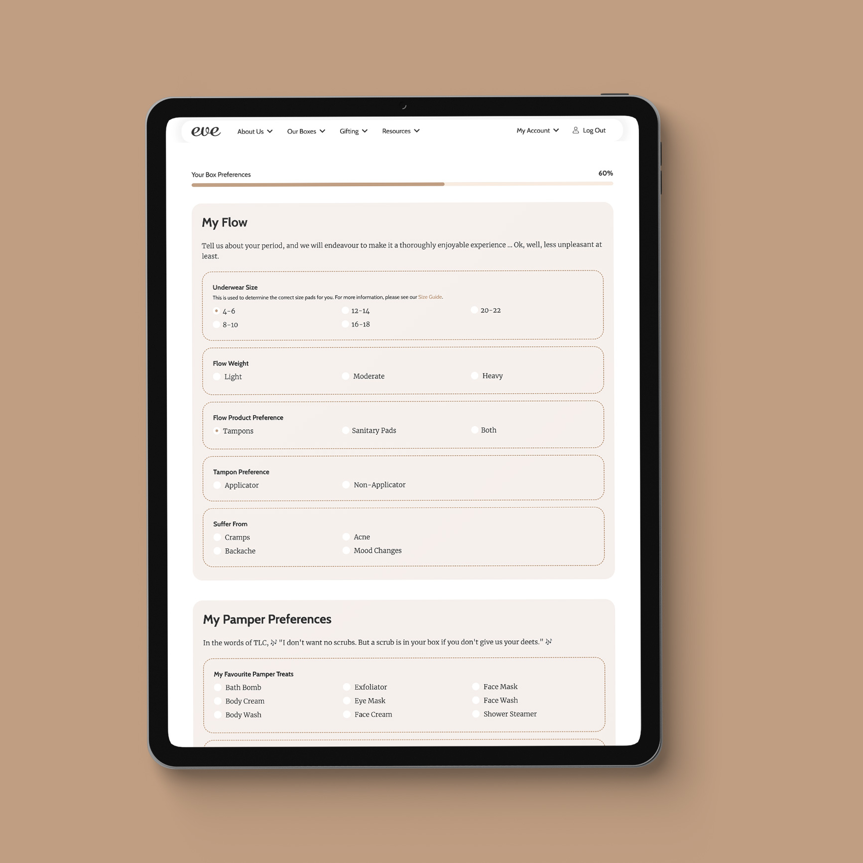 To personalise the subscription boxes, we developed an intuitive questionnaire that collects user preferences and menstrual cycle details. This data is used to curate the contents of each box, ensuring a tailored experience for every subscriber.